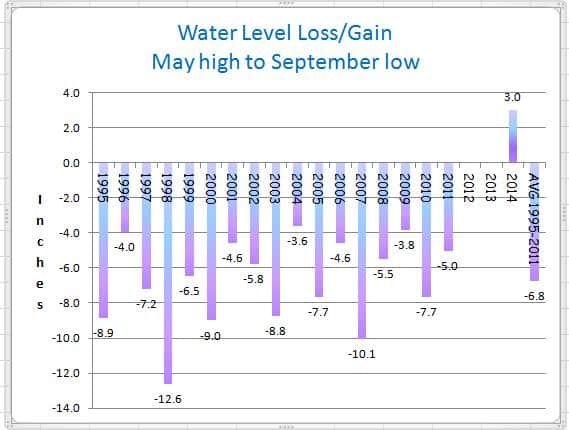 Plus the water level in the lake has gone UP 3 inches since the last part of June.  In the past 20 years, the average LOSS is 6.8 inches.  See chart from USGS data.  Can you imagine where the level will be after this winter?