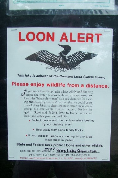The Association contacted the DNR about placing a prominent sign indicating the restricted high speed boating hours on our lake. As you can see in the attached pictures, they followed through and a new sign has been posted. In addition, a new message board was installed with additional information along with several life preservers for use. Also, the Association obtained a “loon alert” poster to add to the message board warning boaters to avoid the loons as much as possible. We now have a contact person at the DNR that seems receptive to ideas to improve the public boat launch. If you have any suggestions contact the Association through our email address of bearlakekalkaska@gmail.com